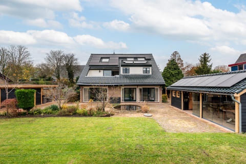 De halfopen keuken in hoekopstelling is luxe uitgevoerd met granieten werkblad en wandbetegeling. De keuken beschikt over diverse inbouwapparatuur zoals een 5-pits gaskookplaat, RVS afzuigkap, combimagnetron, koel-/vriescombinatie, Quooker en een vaatwasser.